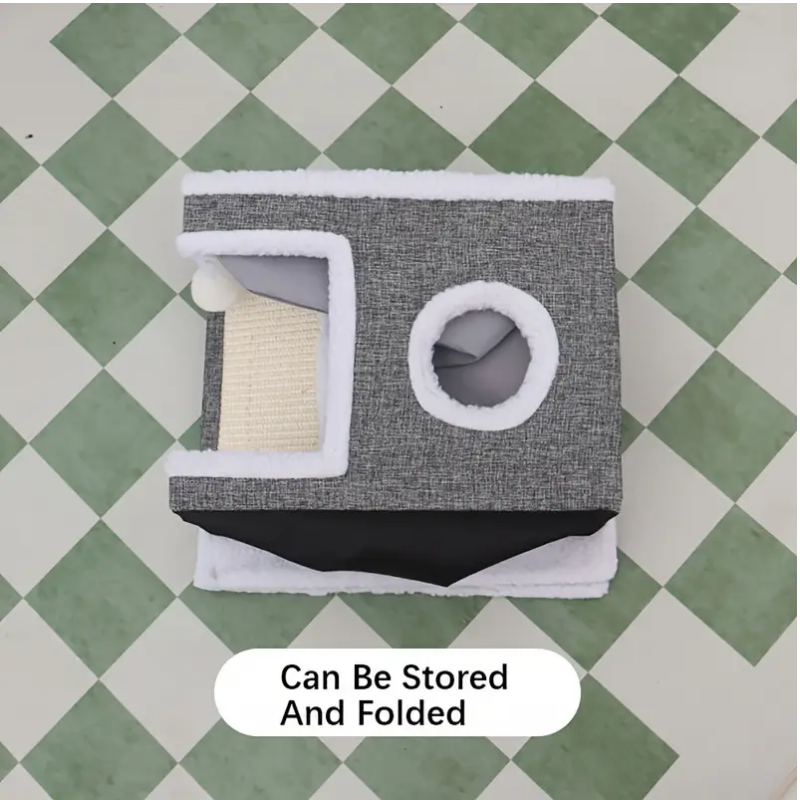 The Luxury Double-Layer Cat Bed Cave Sofa provides your cat or small dog with a stylish space for rest and play. Its dual-purpose design includes an enclosed cave for privacy and a lounging area above for relaxation. Crafted from soft, durable nylon and featuring a sisal scratching surface, this bed supports your pet's natural behaviors while protecting your furniture. The foldable structure allows for easy storage, and the non-slip base keeps it securely in place. Dimensions are 41 cm x 41 cm x 32 cm (refer to the image).